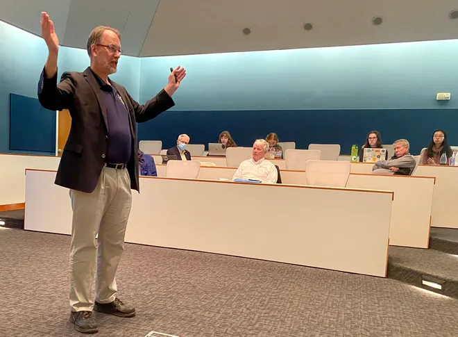 Алан Мастард выступает перед аудиторией в Институте журналистики Дональда Рейнолдса Университета Миссури на тему российской агрессии в Украине. Сентябрь 2022 года. Фото: Roger McKinney/Columbia Daily Tribune