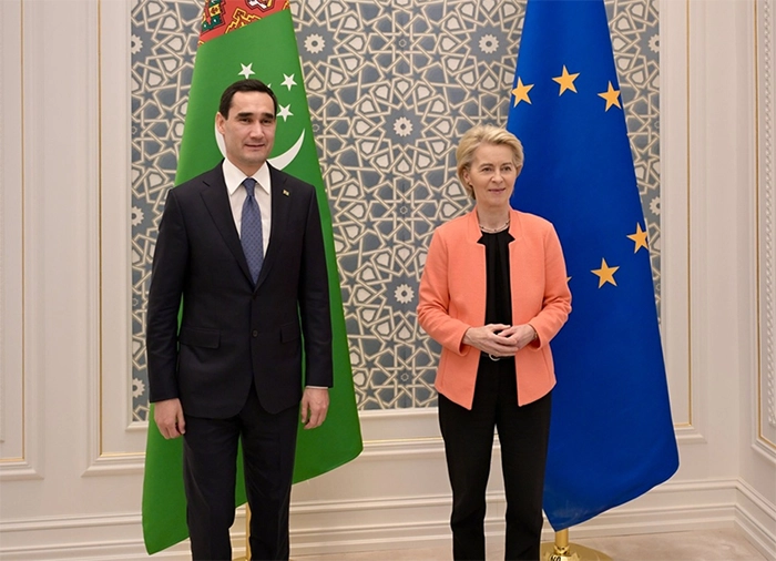 Президент Туркменистана Сердар Бердымухаммедов и Председатель Еврокомиссии Урсула фон дер Ляйен. Самарканд, 3 апреля 2025 года.