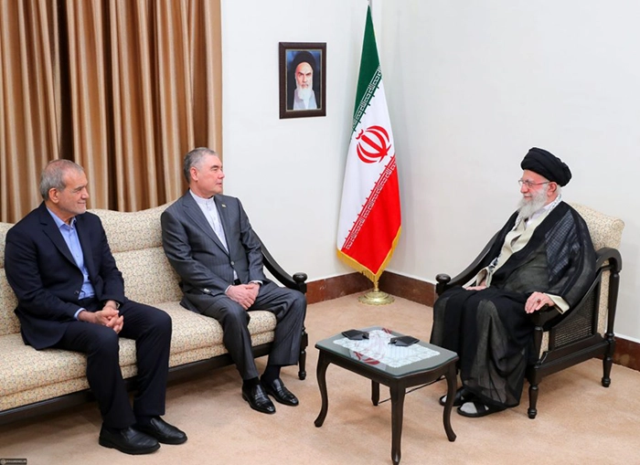 Национальный лидер туркменского народа К. Бердымухаммедов на приеме у Верховного лидера Ирана Али Хаменеи. Слева — президент Ирана Масуд Пезешкиян. 28 августа 2024 года. Фото: IFP News