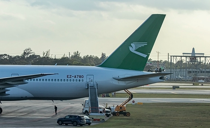 Туркменский «Борт №1» с поврежденной хвостовой частью на ремонте в международном аэропорту Форт-Лодердейл, штат Флорида. 18 февраля 2026 года. Фото: X / Branch Floridian