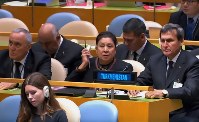 Посол Туркменистана в США Меред Оразов (слева), Постпред Туркменистана при ООН Аксолтан Атаева и министр иностранных дел Туркменистана Рашид Мередов на заседании Генеральной ассамблеи ООН. 2018 год.